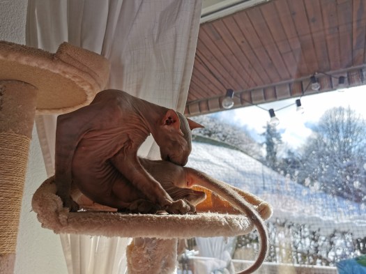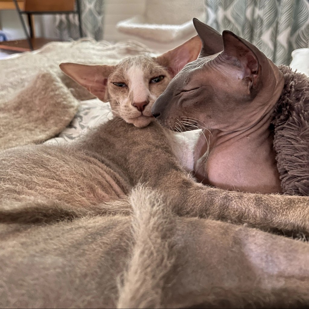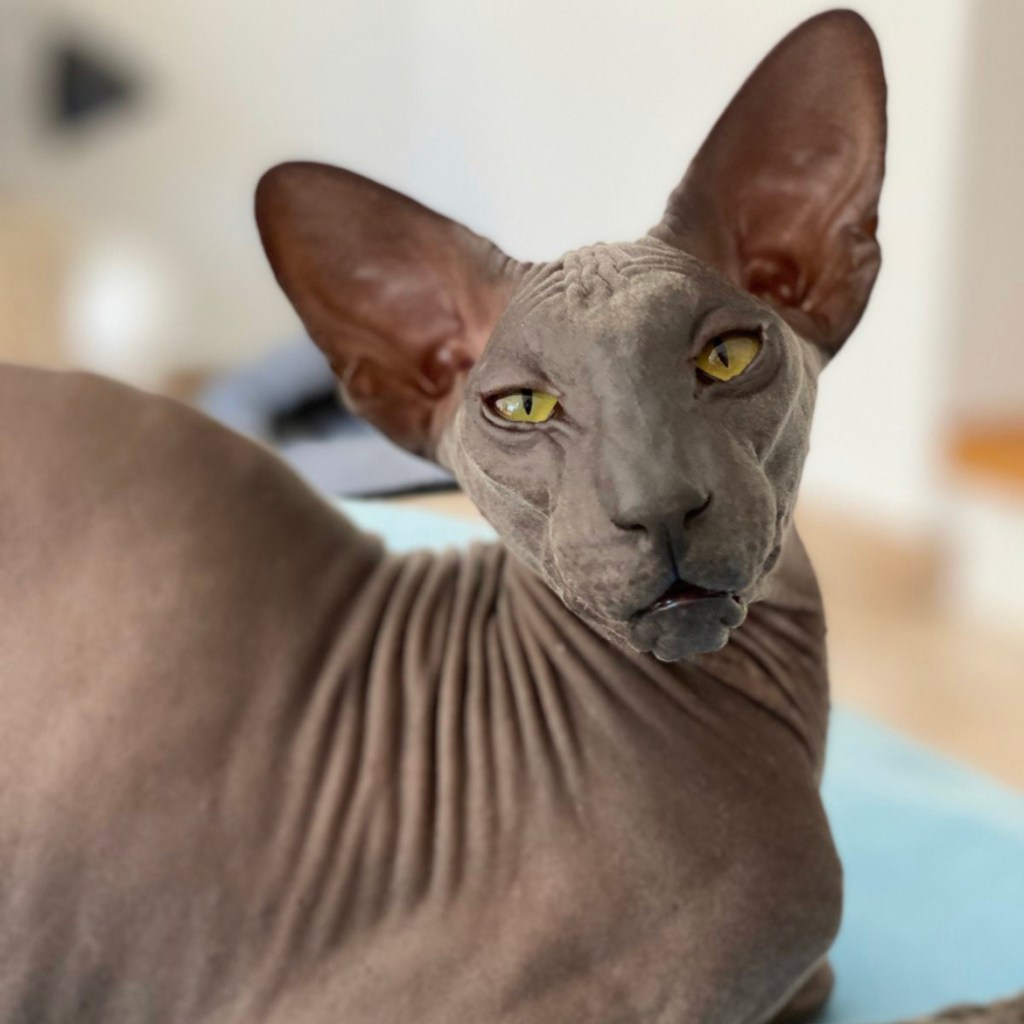 Absence totale de poils. Le type nu est totalement dépourvu de duvet, de cils et la plupart du temps de vibrisses. Son aspect cutané ne présentera aucune variation tout au long de son existence.