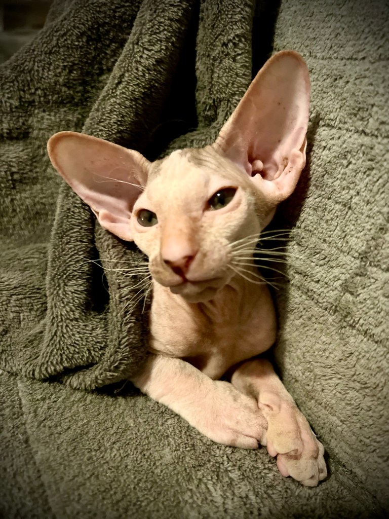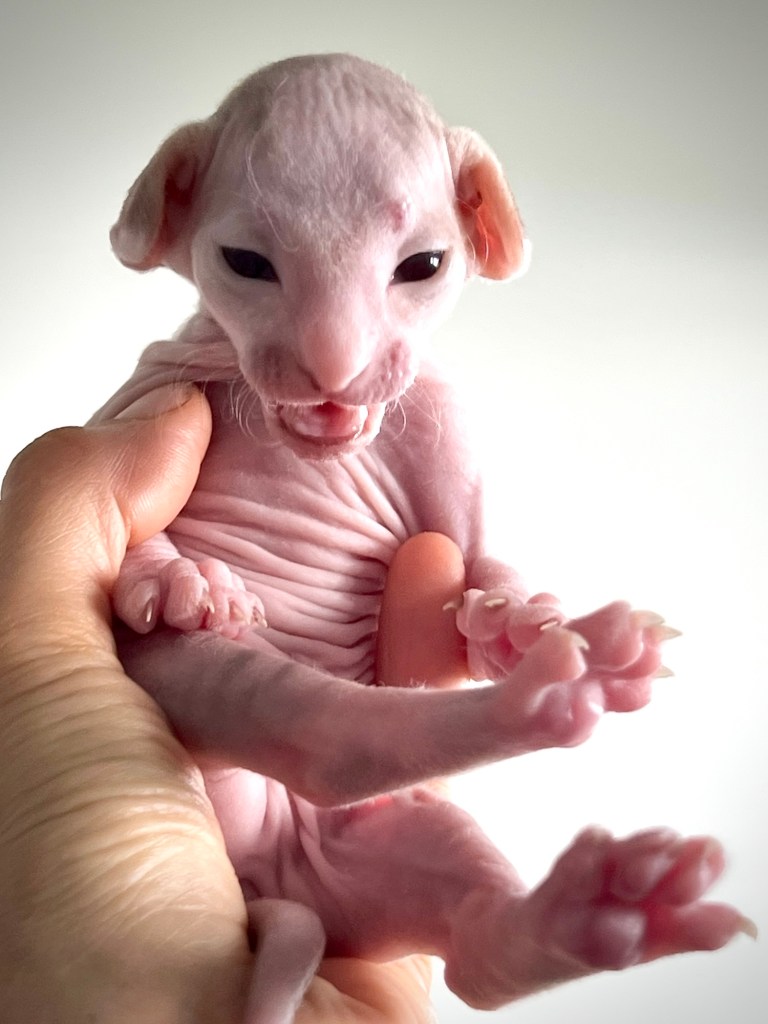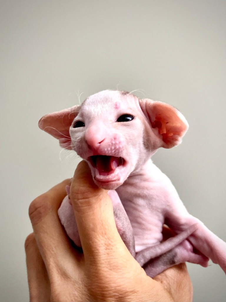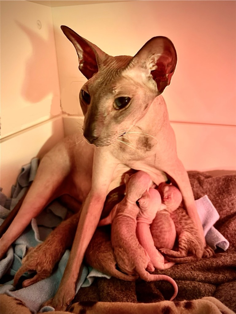 Dès l’arrivée de Vlad en terre helvète, il a su conquérir le coeur de la douce Olga. Si la rencontre fut harmonieuse, les semaines qui ont suivi ont été un peu difficiles pour la future mère: une petite affection dentaire ayant nécessité une antibiothérapie et une extraction dentaire prévue à l’issue de la gestation. Cependant, il s’est avéré qu’Olga est allergique à l’amoxicillin et a fait une violente crise allergique, nécessitant l’introduction d’une corticothérapie, compromettant le développement embryonnaires. Les petits sont nés à terme, mais avec des poids critiques, laissant craindre le pire. Soutenue par les éleveuses kazakh et russe, leurs conseils ont été mis à profit pour remplumer les petits qui ont eu une évolution normale, malgré un départ catastrophique. en quelques semaines, les chatons ont explosé les courbes de croissances et les examens vétérinaires se sont montrés plus que rassurants.