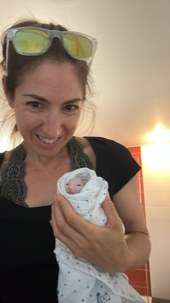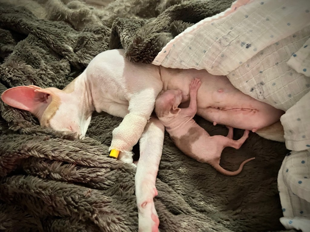 Chatonne unique d’une femelle primipares, les conditions étaient réunies pour faire de cette gestation un combat épique vers la survie de la petite. Un suivi très rapproché, des visites chez le veto tous les jours pour mesure du cœur fœtal; je n’ai jamais été aussi près de mes équipes vétérinaires qui ont fait un super boulot pour mener à terme la mise bas. La petite Whoopi est née par césarienne, entraînant à maman Ariel des complications chirurgicales importantes, qui ne l’ont pas découragée d’être une excellente mère pour sa petite.